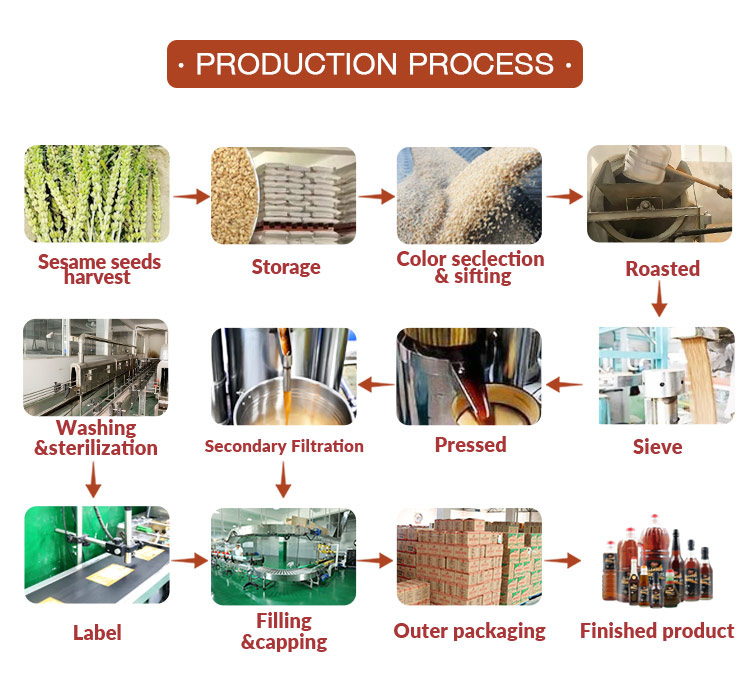 Prensado físico puro: el aceite de sésamo de alta calidad se produce principalmente mediante prensado físico (como el método de sustitución de agua para el aceite de sésamo molido en pequeña escala), sin involucrar solventes químicos, preservando así el sabor natural y la nutrición del sésamo en la mayor medida.